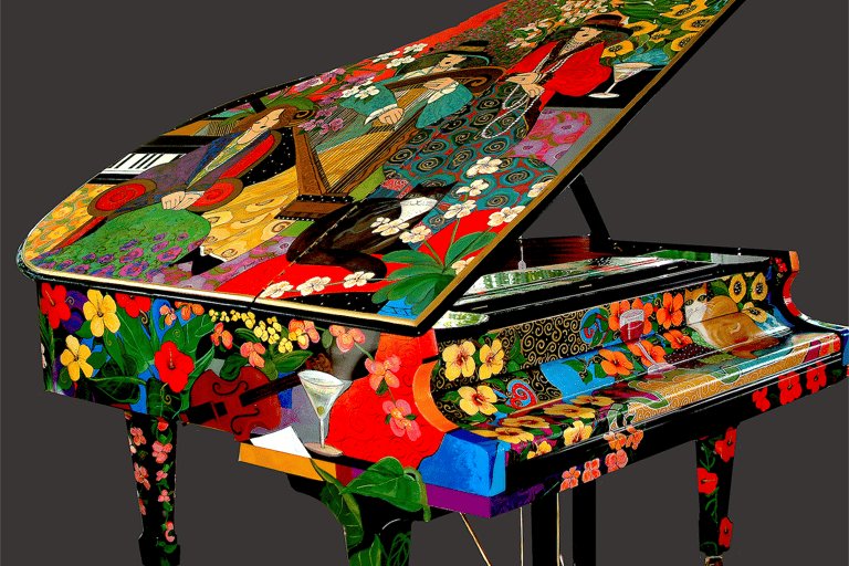 Cultured Pearls" Hand Painted Grand Piano Acrylics & Oil in permanent Collection of Lindy & Gary Dikin in Laguna Niguel, California